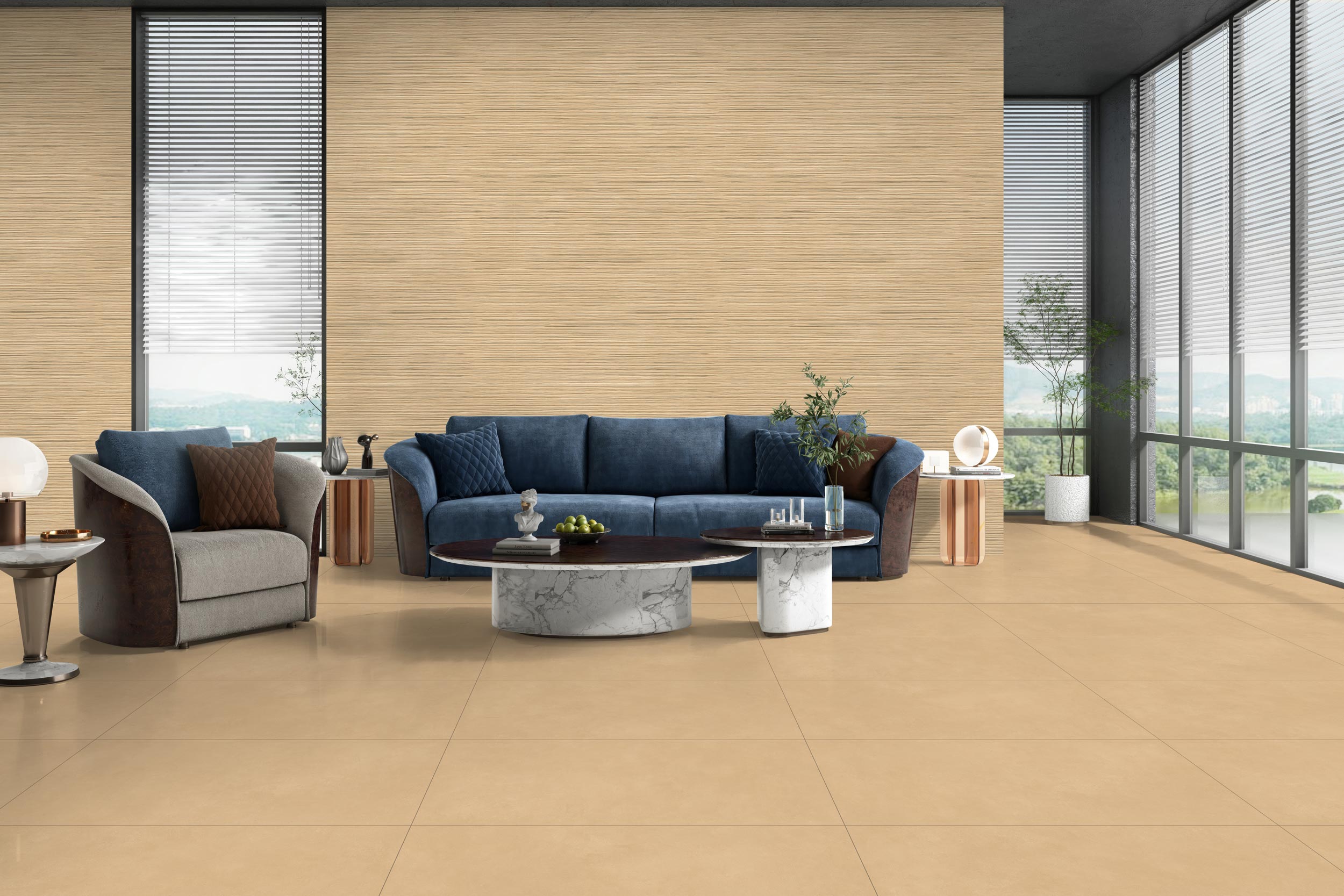 Highlight your style with marble-effect or artistic coloured living room iles that serve as a stunning feature in your living room. Make a strong impression with neutral tones like white and grey that provide a luxurious backdrop, while dark blue and black colours create an elegant vibe.